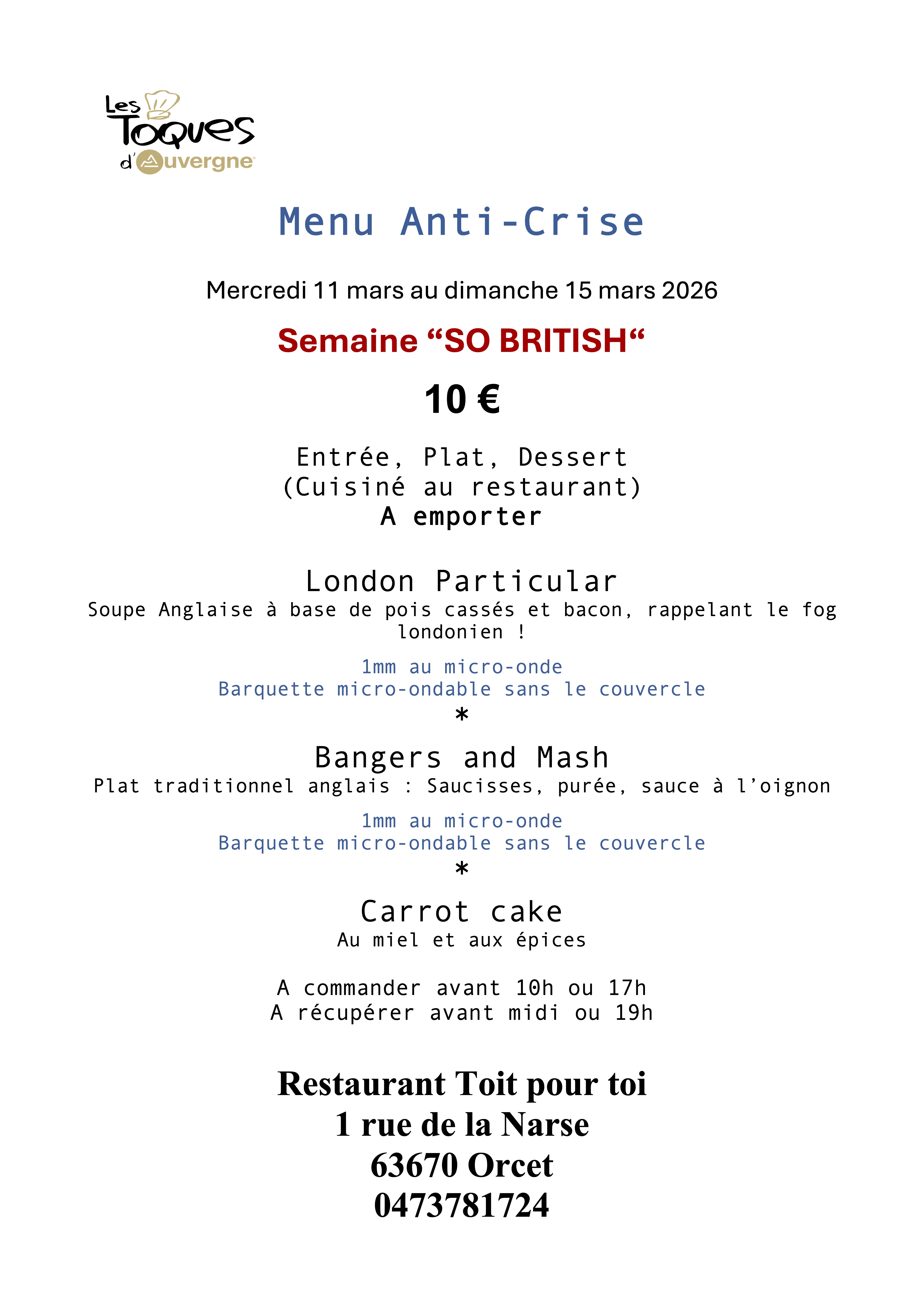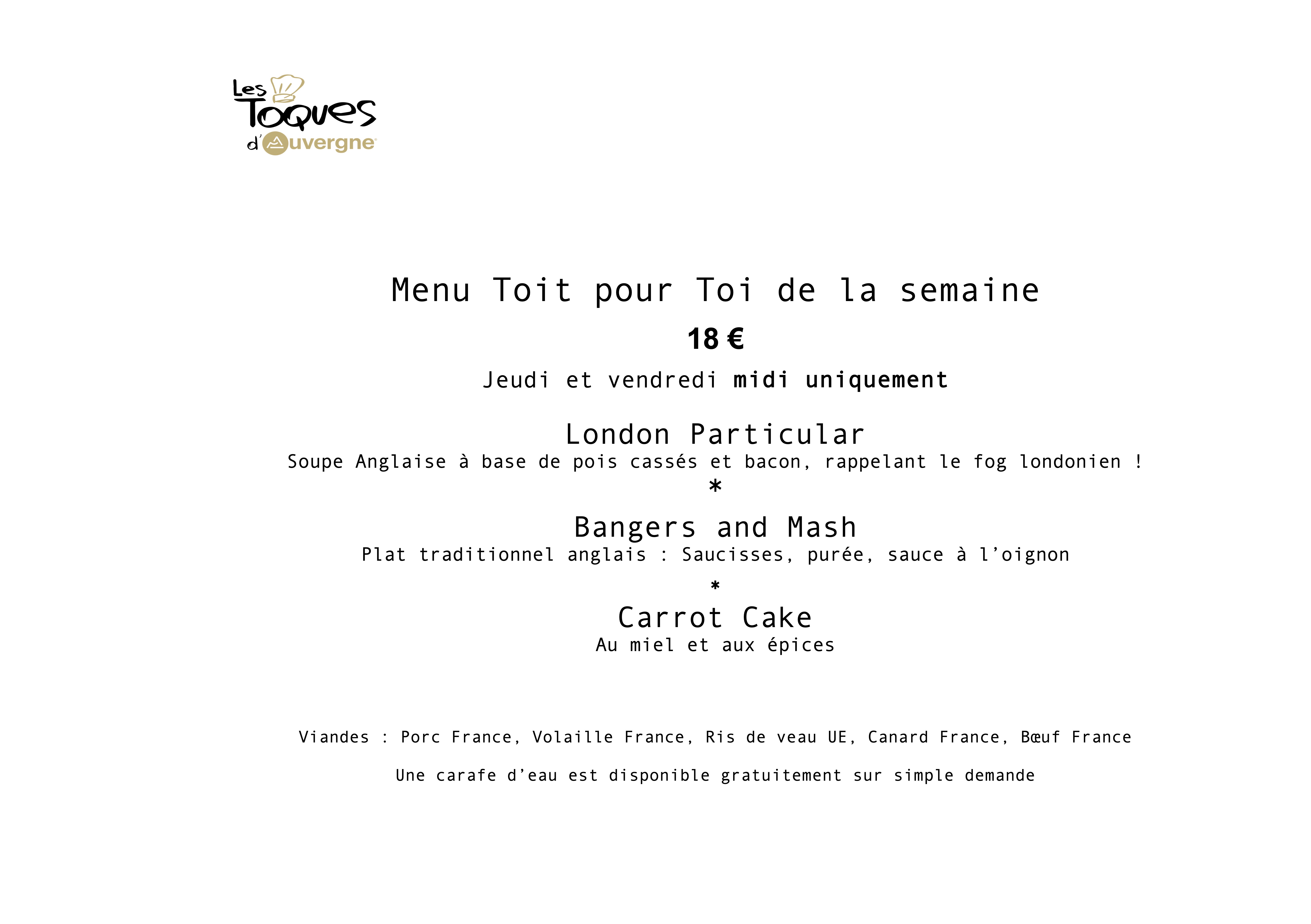 London Particular Soupe Anglaise à base de pois cassés et bacon, rappelant le fog londonien ! * Bangers and Mash Plat traditionnel anglais : Saucisses, purée, sauce à l’oignon * Carrot cake